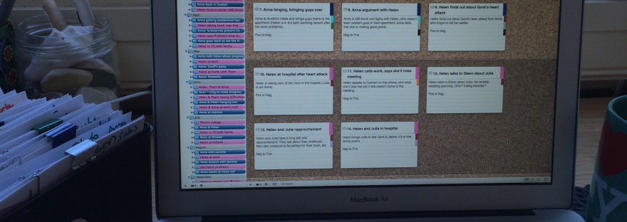 I spent this week transferring all the information from my dozens of index cards onto my laptop. Not only that, I’ve also reviewed and expanded each scene, making sure they all fit logically into the overall novel and refining and clarifying my ideas where necessary.